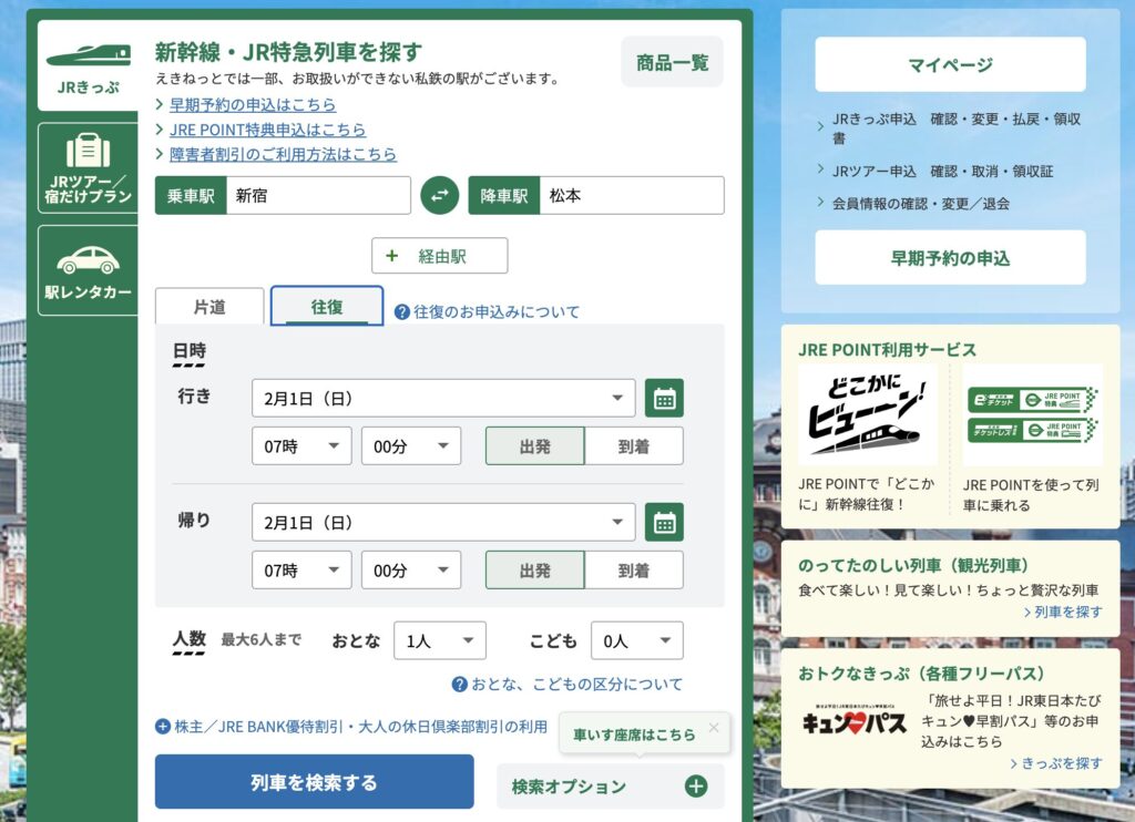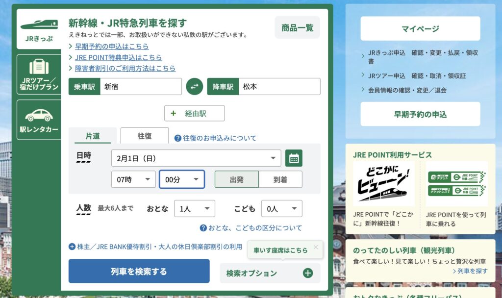 2,新幹線・JR特急列車を探す欄の【乗車駅】【降車駅】に該当する駅を入力し、日時を入力する。(今回の場合は新宿乗車➩松本駅降車とします)