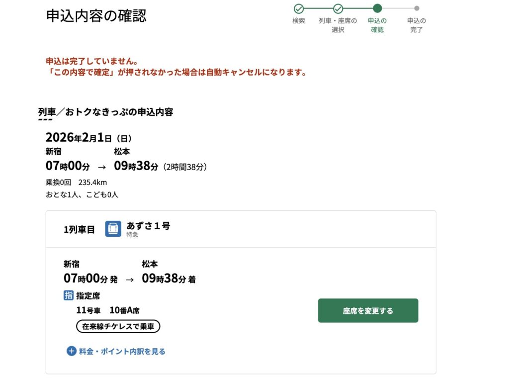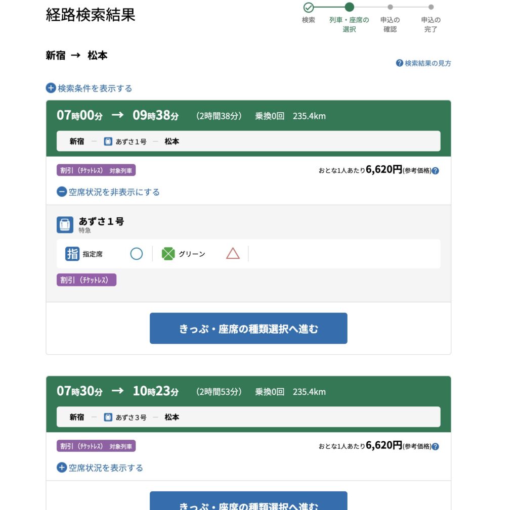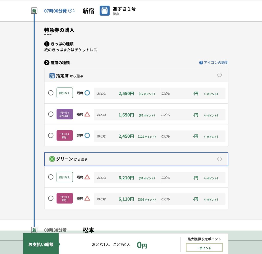 重要なポイント:特急あずさには自由席がありません(全車指定席)