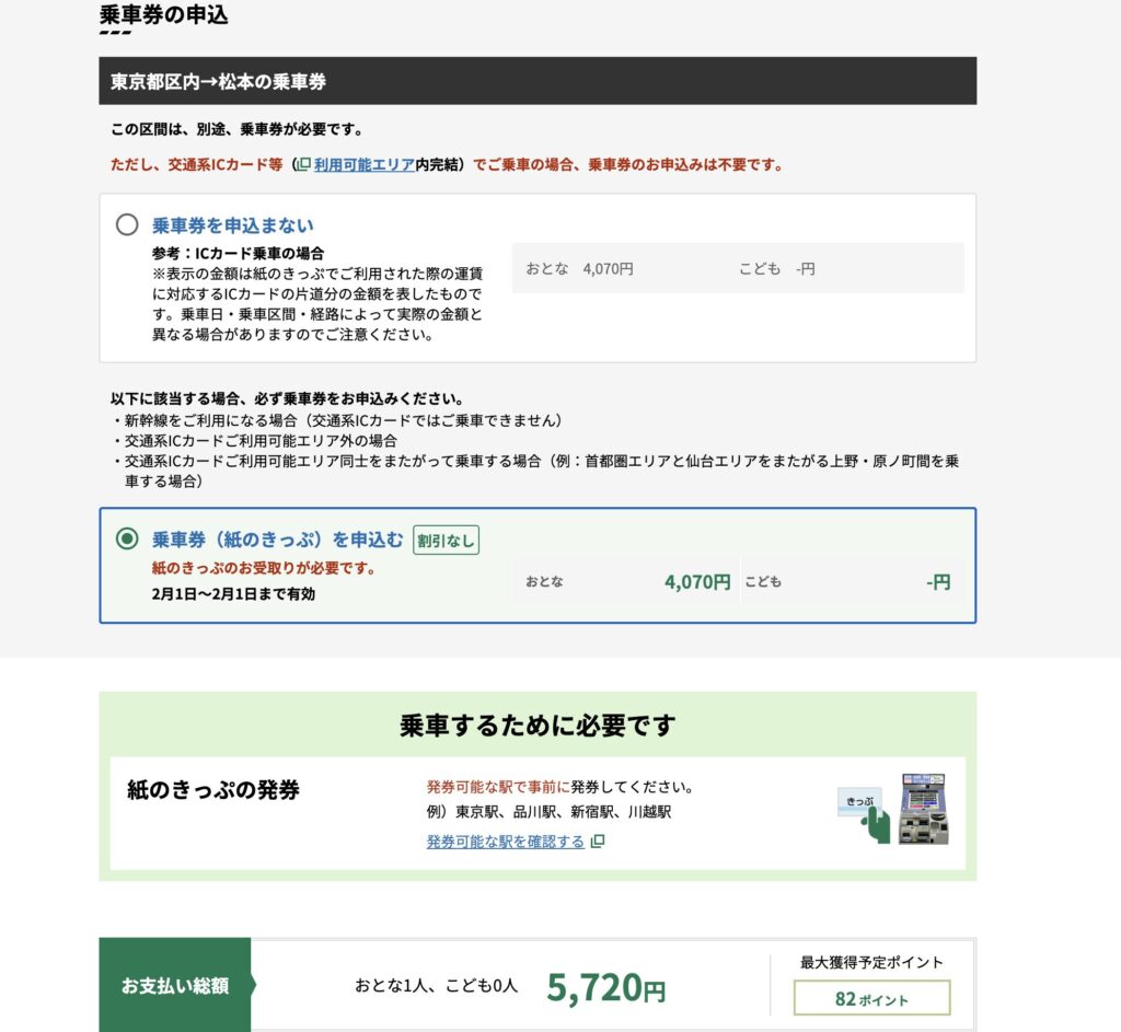 乗車券は、東京(新宿など)から松本まで移動するための基本のきっぷです。