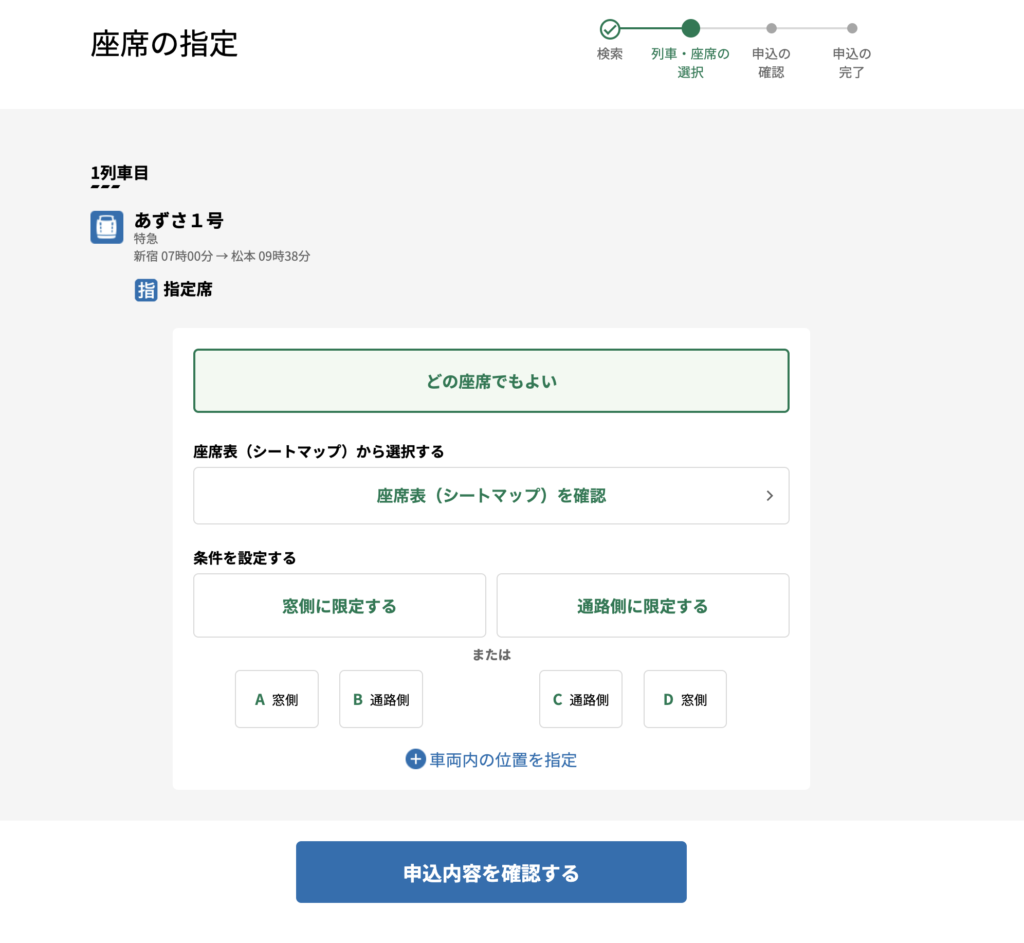 どの座席でもよい、なんて欄もありますがほとんどの方は座席を選択するかと思います。