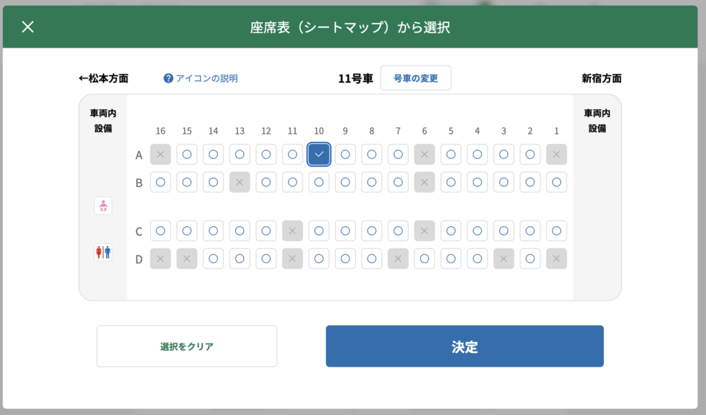 座席の位置は、「◯号車+座席番号(列)+席アルファベット」で表記されます(例:11号車 10A)。