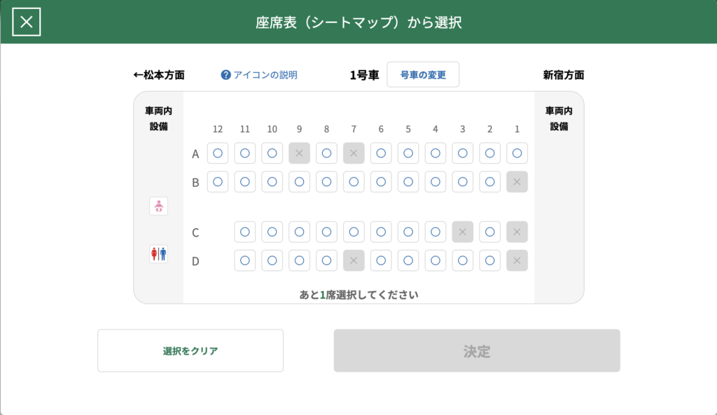 トイレの配置は【えきねっと】で予約する際の座席表でも確認できます。