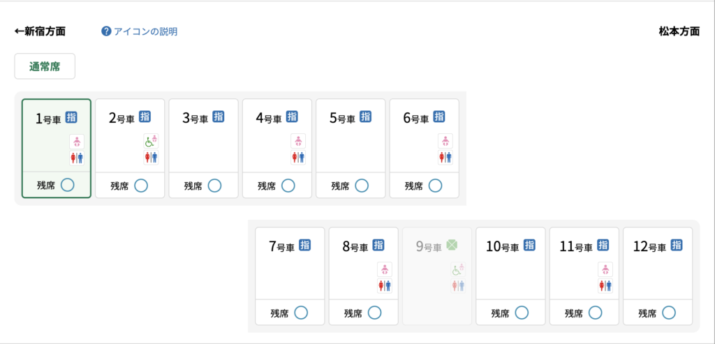 また、2号車と9号車(グリーン車)には車椅子対応のトイレがあるので、必要な方は少なくともその号車の席を予約する事をおすすめします。