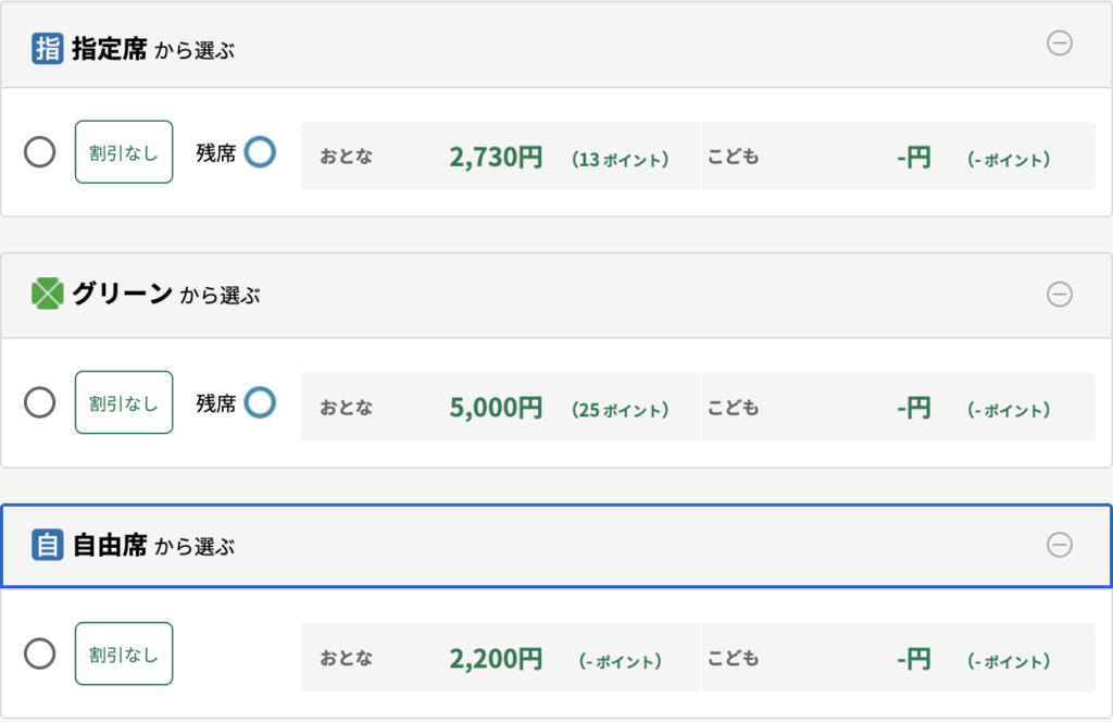 少しでも安くしたいなら自由席、確実に座って行きたいなら指定席が向いています。土日や連休は混みやすいので、座って移動したいなら指定席のほうが安心です。
