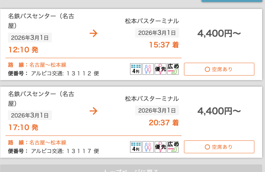 ハイウェイバスドットコムの運賃表では、名鉄バスセンター・栄・桃花台BS→松本方面が大人片道3,800円からの表示になる日があります(変動運賃)。