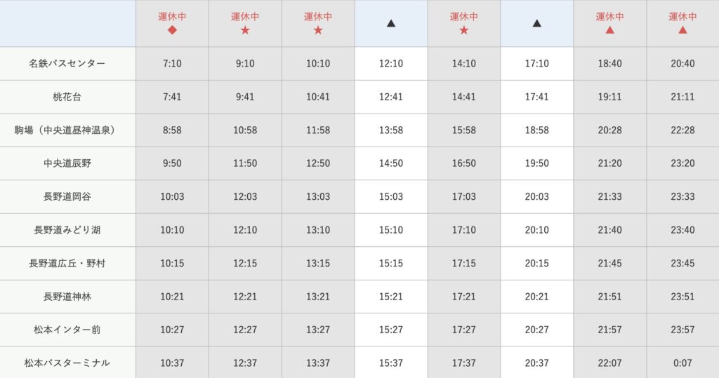 また、高速バスは名古屋から松本方面の路線があり、所要時間の目安は約3時間30分前後。時間よりも交通費を抑えたい人に向いています。