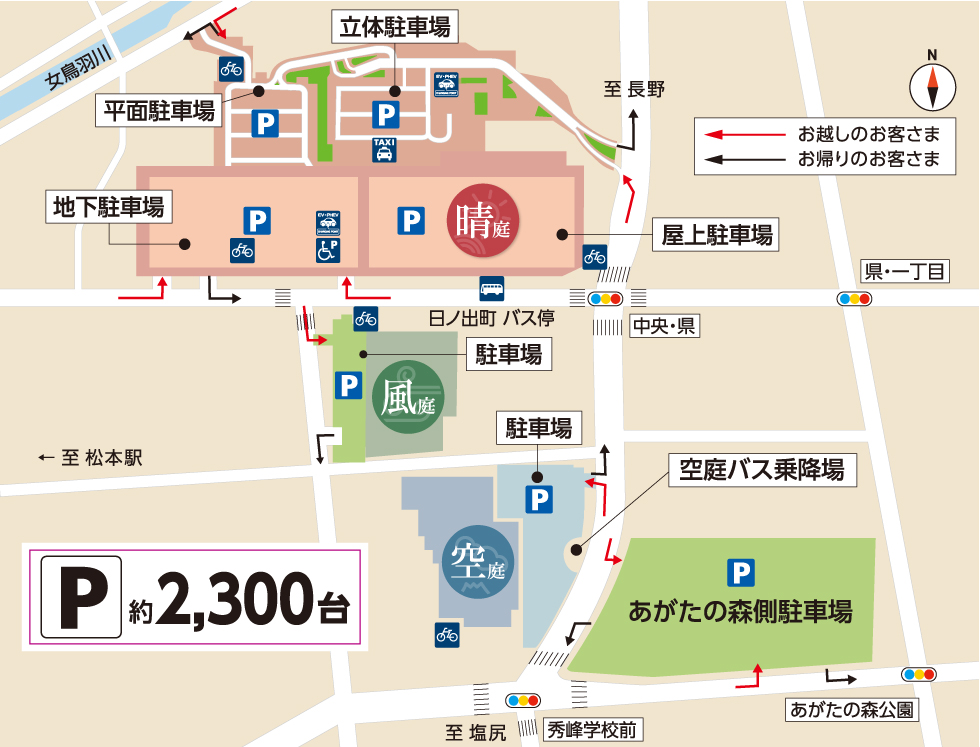 イオンモール松本の駐車場はトータル4箇所あり、この中でも松本城に近いのは【晴庭駐車場】となっているので、そこを目指して行く事をおすすめします。